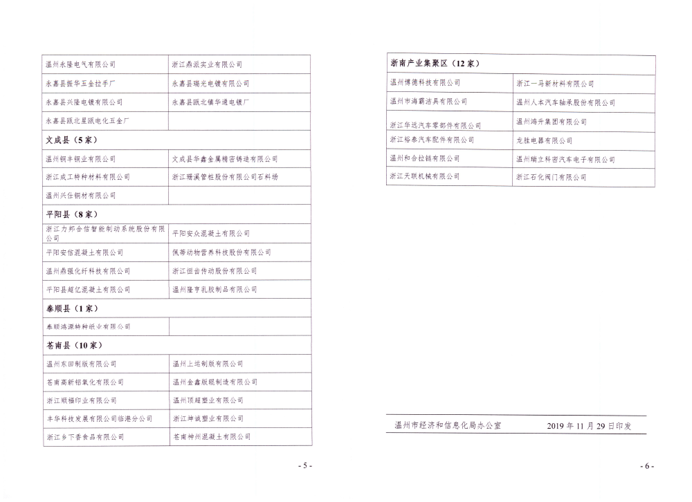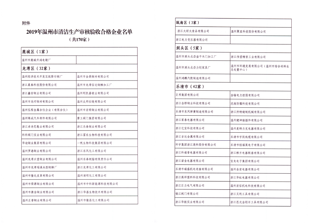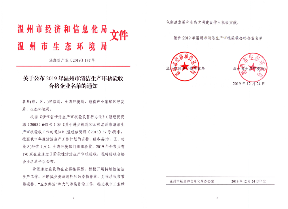 根據(jù)溫州市相關(guān)標(biāo)準(zhǔn)文件要求,經(jīng)各部門(mén)專(zhuān)家的嚴(yán)格評(píng)審,我公司于2019年先后被評(píng)為“溫州州市節(jié)水型企業(yè)“、”溫州市清潔生產(chǎn)審核驗(yàn)收合格企業(yè)“